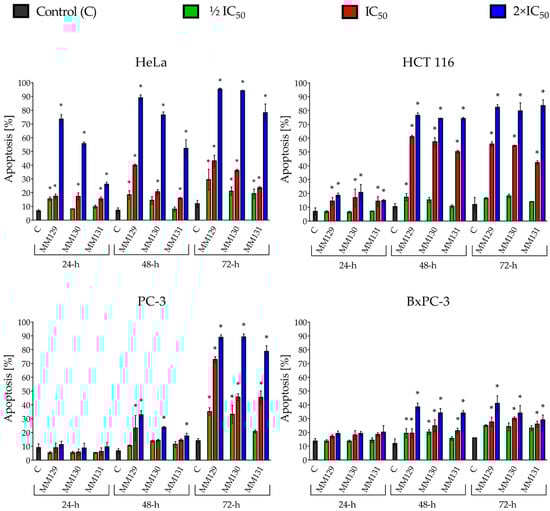 Percentage of apoptotic cells in the examined human cancer cell lines (Hela, HCT 116, PC-3, and BxPC-3) following 24 h, 48 h, and 72 h treatment with MM129, MM130, and MM131 used at ½ IC50, IC50, and 2×IC50 and determined using FITC Annexin V Apoptosis Detection Kit I. Data are shown as the mean ± SD. * p < 0.05 indicates a statistically significant difference compared to the negative control. N = 1 × 104.