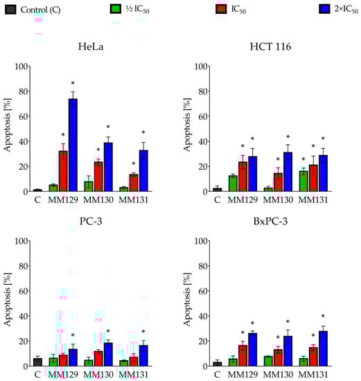 Apoptosis induction in human cancer lines (Hela, HCT 116, PC-3, and BxPC-3) treated for 48 h with MM129, MM130, and MM131 at ½ IC50, IC50, and 2×IC50 (obtained in the MTT assay). The results were based on AO/EB double staining, which allowed the distinguishing of viable, apoptotic, and necrotic cells. Data are shown as the mean percentage of apoptotic cells ± SD values. Significant differences (p < 0.05) compared to the negative control (*). N = 200.