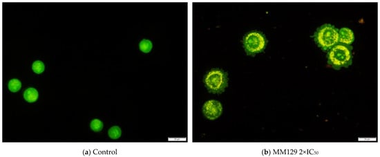 Representative images of HeLa cells obtained after AO/EB double staining following their 48 h incubation with MM129 at 2×IC50. (a) Negative control group (control cells)—rounded cells with a uniformly distributed green-fluorescent nucleus; (b) experimental group (apoptotic cells)—yellow-orange fluorescence and characteristic cells’ membrane blebbing (apoptotic bodies formation). The scale bar is 20 μm. Magnification 40×.
