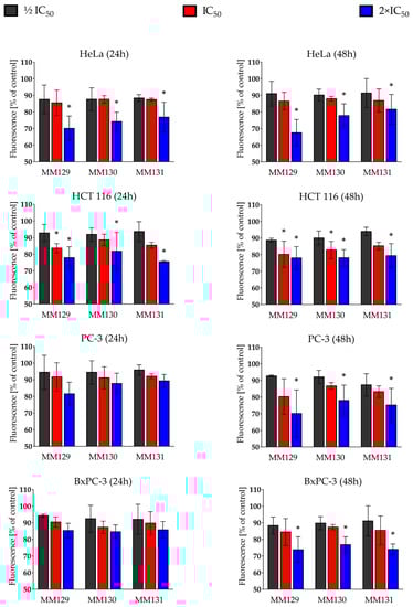 Changes in mitochondrial membrane potential (ΔΨm) in human cancer lines (Hela, HCT 116, PC-3, and BxPC-3) after 24 h and 48 h exposure to MM129, MM130, and MM131 at ½ IC50, IC50, and 2×IC50 (obtained in the MTT assay) using MitoTracker Red CMXRos. Data are presented as the mean ± SD relative to the control group normalized to 100%. * p < 0.05 indicates a statistically significant difference compared to the negative control.