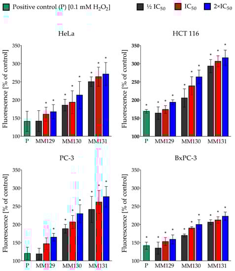 Changes in intracellular ROS level in the human cancer cell lines (HeLa, HCT 116, PC-3, and BxPC-3) following their 2 h treatment with MM129, MM130, and MM131 at ½ IC50, IC50, and 2×IC50 (values obtained in the MTT assay). ROS level is expressed as the mean percentage of fluorescence intensity of H2DCFDA relative to control ± SD. Significant differences (p < 0.05) compared with negative control (*).