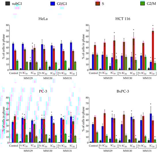Cell cycle phase distribution of HeLa, HCT 116, PC-3, and BxPC-3 cancer cells after 24 h incubation with MM129, MM130, and MM131 at ½ IC50 and IC50 are shown as the mean percentage of cells of a particular cell cycle phase ± SD. Significant differences (p < 0.05) compared with control (*). N = 1 × 104.