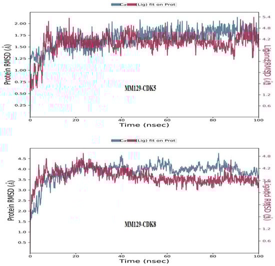RMSD of the Cα backbone of human CDK5-MM129 and CDK8-MM129 receptor–ligand complex observed during the 100 ns of MD simulation.