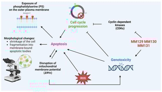 The potential mechanism of action of MM129, MM130, and MM131. Investigated sulfonamides cause DNA single-strand and double-strand breaks and simultaneously inhibit CDKs. High levels of DNA damage and inhibition of CDKs lead to cell cycle arrest. As the effect of high genotoxic stress and the action of the G1/S cell cycle checkpoint, the cell is directed to the apoptosis pathway. The consequences of apoptosis include cell morphological changes and the exposition of PS on the outer plasma membrane. Furthermore, apoptotic changes cause loss of ΔΨm and lead to the opening of PTP, which results in ROS formation. The continuous accumulation of ROS may enhance genotoxic stress and apoptosis, leading to a self-perpetuating cycle of changes.
