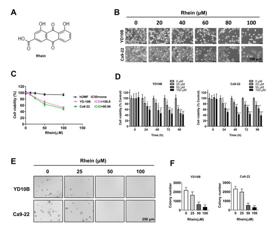 Rhein exhibits antiproliferative effects in OC cells. (A) Chemical structures of rhein. (B) The cell morphology of YD-10B and Ca9-22 cells after treatment with the indicated concentrations of rhein for 48 h was observed under a light microscope (magnification, 100×). (C) The IC50 value of oral cancer cells (YD-10B and Ca9-22) and normal oral epithelial cell (hOMF) was examined by CCK-8 assay at 24 h. (D) OC cells were treated with 0, 25, 50, and 100 μM rhein for 0, 24, 48, 72, and 96 h. Cell viability was measured with CCK-8 assay. (E) Effects of rhein on colony formation in YD-10B and Ca9-22 cells (magnification, 50×). (F) Quantitative graphs of colonies formation. * p < 0.05; ** p < 0.01; *** p < 0.001.