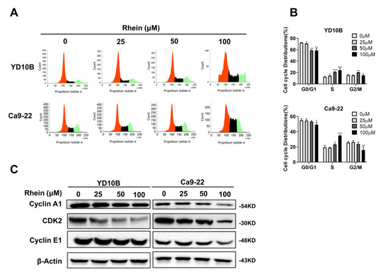 To explore the mechanism of rhein in the inhibition of the growth of OC cells, we evaluated the cell cycle distributions of YD-10B and Ca9-22 cells by flow cytometry following rhein (0, 25, 50, and 100 μM) treatment for 48 h. The results indicated that rhein significantly increased the proportion of S-phase cells in YD-10B and Ca9-22 cells (Figure 3A,B). Then, the effects of rhein were examined using the expression of S-phase-associated proteins, including cyclin A1, cyclin E1, and CDK2, by Western blot analysis. As shown in Figure 3C, rhein downregulated the expression levels of cyclin A1, cyclin E1, and CDK2 in YD-10B and Ca9-22 cells.
