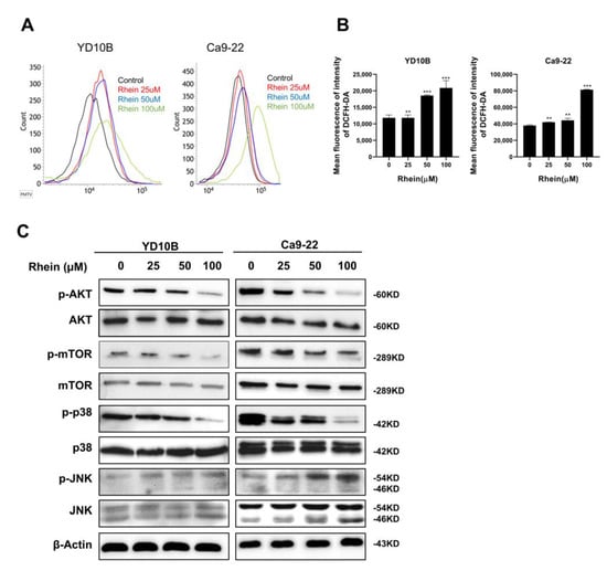Increasing evidence has shown that ROS levels are involved in cellular apoptosis and cancer progression. To explore whether rhein can induce the ROS level of OC cells, YD-10B and Ca9-22 cells were treated with 0, 25, 50, and 100 μM rhein for 24 h. The production of ROS was measured using a 2′,7′-fichlorofluorescein diacetate probe (Merck KGaA, Darmstadt, Germany) and then analyzed through flow cytometry. As the results showed, the ROS level was increased by treating YD-10B and Ca9-22 cells with rhein (Figure 5A,B). The AKT/mTOR signaling pathway plays a crucial role in tumorigenesis [29,30]. Then, we determined whether rhein had any effect on the AKT/mTOR signaling pathway. As presented in Figure 5A, rhein treatment suppressed p-AKT, p-mTOR, and p-p38 expression levels and upregulated JNK expression levels in YD-10B and Ca9-22 cells. These results suggest that rhein inhibits OC cell growth by inducing ROS generation and inactivating the AKT/mTOR signaling pathway.