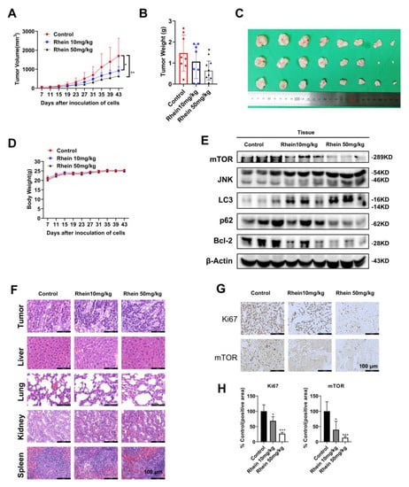 A tumor xenograft mouse model was used to assess the anticancer activity of rhein in vivo. Tumor-bearing mice received intraperitoneal injections of saline and two dosages of rhein (10 and 50 mg/kg) 3 times a week for 36 days. As observed, the rhein-treated group (10 or 50 mg/kg bodyweight) had significantly inhibited tumor growth compared with the vehicle-treated group (Figure 6A–C). Furthermore, the weight of mice was monitored every 4 days, and the rhein administration did not affect it (Figure 6D). The histological structure of the liver, lung, kidney, and heart was examined after 36 days of rhein treatment in tumor-bearing mice. As observed, the histological structure of the liver, lung, kidney, and heart had no significant changes compared with the vehicle group (Figure 7F). These results demonstrated that rhein could effectively inhibit tumor growth without exhibiting obvious toxicity. To further confirm whether the results of in vitro experiments were consistent with those in vivo, tumor tissues of tumor-bearing mice were collected for immunohistochemical (IHC) staining and Western blotting. According to the results, the expression levels of mTOR, p62, and Bcl2 were significantly downregulated, and those of JNKand LC3 were upregulated after treatment with rhein (Figure 6E). In addition, IHC results showed that protein levels of Ki67 and mTOR were downregulated after treatment with rhein, which was consistent with in vitro data (Figure 6F,H). Overall, these results demonstrated that rhein effectively inhibited OC tumor growth through the mTOR pathway in vivo and has the potential to be used as a chemotherapeutic agent for OC.