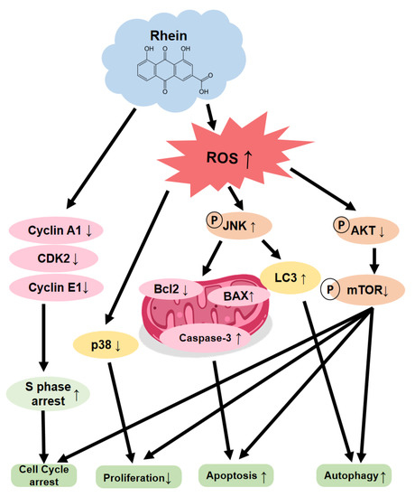 - Wang, A.; Jiang, H.; Liu, Y.; Chen, J.; Zhou, X.; Zhao, C.; Chen, X.; Lin, M. Rhein induces liver cancer cells apoptosis via activating ROS-dependent JNK/Jun/caspase-3 signaling pathway. J. Cancer 2020, 11, 500–507. [Google Scholar] [CrossRef]