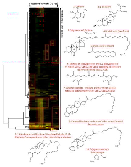 The coffee silverskin extract was obtained by supercritical CO2 extraction and thus exhibited a low polarity. Therefore, a relatively nonpolar biphasic solvent system composed of n-heptane and methanol (1/1, v/v) was used to produce by centrifugal partition chromatography (CPC) a series of fractions of simplified chemical composition. A total of 11 final fractions was obtained, containing CS metabolites organized in a decreasing order of polarity (Figure 1). From the 13C NMR spectra of the 11 fractions, the chemical shift values and signal intensities were collected and a bucketing strategy resulted in a table with 11 columns (one per fraction) and 258 rows (one per chemical shift bin containing a 13C NMR peak detected in at least one fraction). This table was submitted to hierarchical clustering analysis (HCA) on the rows. In this way, statistical correlations between 13C NMR peak fingerprints belonging to a single structure and thus evolving similarly in successive fractions were easily visualized as “chemical shift clusters” in the heatmap (Figure 2). By confronting these clusters to our predictive NMR database of natural molecules, followed by manual interpretation of 2D NMR data for validation or further structure elucidation, several significant constituents of the coffee silverskin extract were identified. As a result, we found that the first fractions F01-F02, representing together ≈53% of the extract mass, were mainly composed of di- and triacylglycerols, as well as β-sitosterol. In the fractions F03-F06, which represented ≈24% of the extract mass, a range of diterpene fatty acid esters derived from cafestol and kahweol were detected as largely major constituents. Among these kaurene-type diterpenes, cafestol linoleate and kahweol linoleate were unambiguously identified by NMR. Other minor derivatives were detected, but neither NMR nor LC/MS analyses helped to 100% confirm the nature of their fatty acid chains, probably due to poor ionization capacity of these metabolites in our analytical conditions. Based on literature data, we can suspect the prevalence of palmitate, linoleate and stearate fatty acid chains [13,14,15,16]. Fractions F07 and F08 which represented together ≈7.5% of the extract mass, were mainly composed of sterols, mainly stigmastane-3,6-dione, and free fatty acids. Finally, in the most polar fractions F09-F11 recovered over the extrusion step and representing ≈15% of the extract mass, caffeine was identified as the largely major constituent, followed by other diterpene fatty acid esters among which there were 19-Norkaura-1,4-(18)-diene-18-carboxaldehyde 16,17-dihydroxy-3-oxo derivatives.