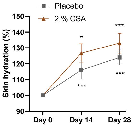 Graphical representation of the hydration content (%), before (day 0) and after 2 (day 14) or 4 (day 28) weeks of treatment with placebo or 2% CSA in 21 volunteers. Values obtained at D14 or D28 were normalized to the corresponding levels at D0. Mean and standard error of the mean (SEM) are shown. Two-way ANOVA statistical analysis was applied for significance between treatments and initial condition. * p ≤ 0.05, *** p ≤ 0.001.