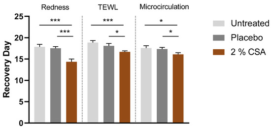Treatment with CSA after irritation with SLS had a regenerative effect on the skin. The recovery time of the skin parameters redness, microcirculation and TEWL was significantly reduced compared to untreated conditions (19.4%, 7.6% and 11%, respectively). In addition, the recovery time improvement in redness, microcirculation and TEWL was significant compared to placebo treatment (Figure 6). The positive outcome was also evident from the questionnaire where 95.2% of volunteers described that the treatment with CSA hydrated their skin and made their skin smoother. In total, 90.5% of the volunteers reported that the treatment with CSA reduced skin dryness after irritation (Table 3).