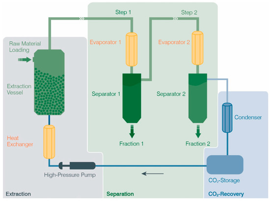 Supercritical CO2 extraction of coffee silverskin was carried out using large-scale equipment. The extraction system consisted of stainless-steel vessels with a total volume of 1500 L. Temperature and pressure were measured inside the vessels and independently modified. A specific extraction pressure of 250–300 bar, a temperature between 40 and 60 °C and a CO2/starting material ratio of 20 to 50 were applied. The bulk density of the milled starting material ranged between 550–600 kg/m3 and the vessel was loaded accordingly with coffee silverskin. The technical process of CO2 extraction is depicted in Figure 7. The extraction process is initiated by pressurization and temperature increase, thereby modifying the density of liquid CO2 to obtain supercritical CO2, which flows through the extraction vessel and pulls along soluble compounds (coffee silverskin extract). A subsequent pressure reduction changes the solubility characteristics of CO2, and the extract is divided, falling into separation vessels (so-called separators). The gradual regulation of the extraction parameters enables the optional generation of different fractions. For this application, only separator 1 was used to generate a total extract without fractionation. To recover the used CO2, the condenser liquefies it and reintroduces it again into the enclosed cycle.