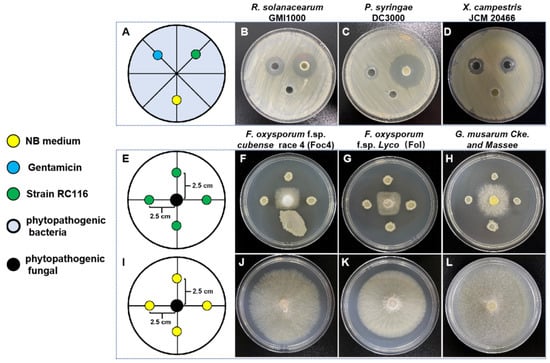 Detection of antagonistic activity of RC116 against phytopathology: (A) the schematic of Oxford cup dual culture for phytopathogenic bacteria with RC116, NB liquid medium as a negative control, Gentamicin (30 μg·mL−1) as a positive control; (B–D) antagonistic activity of RC116 (OD600 = 2) against three plant pathogenic bacteria; (E) the schematic of confrontation dual culture for phytopathogenic fungi with RC116; (F–H) antagonistic activity of RC116 (OD600 = 2) against three plant pathogenic fungi in dual culture test; (I) the schematic of confrontation dual culture for phytopathogenic fungi with NB medium; and (J–L) three plant pathogenic fungi in control dual culture test. The photos were taken at 24 h after inoculation.