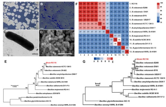 BLASTN searches based on the 16S rRNA gene sequence against the EzBioCloud 16S rRNA gene database revealed that RC116 was most similar to B. siamensis KCTC 13613 (99.93%), B. velezensis CR-502 (99.92%), B. subtilis NCIB 3610 (99.79%), and B. amyloliquefaciens DSM 7 (99.72%), which suggests that RC116 is a member of the genus Bacillus. A phylogenetic tree based on 16S rRNA sequences indicates that RC116 is closely related to B. siamensis KCTC 13613 and B. velezensis CR-502 (Figure 2E).