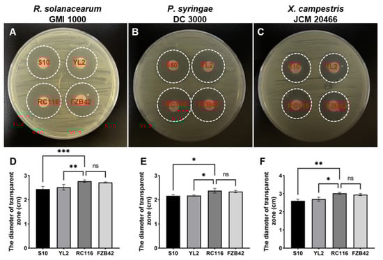 Comparison of antagonistic activity of RC116 with other three B. velezensis strains against three phytopathogenic bacteria. Antagonistic activity assays were performed as described in the Materials and Methods section, the photos were taken after incubation at 30 °C for 24 h, and the diameter of inhibition zones were measured. (A,D) R. solanacearum GMI 1000; (B,E) P. syringae DC3000, (C,F) X. campestris badrii JCM 20466; and (D–F) statistical analysis of the inhibition zones diameters in (A–C), respectively. All assays were repeated thrice and the results represent the means of three independent experiments. Error bars represent standard deviation. * p < 0.05; ** p < 0.01; *** p < 0.001; ns represents no significant difference.