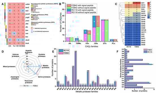 A total of 203 and 195 peptidases were identified in the RC116 and FZB42 genomes via the MEROPS database, respectively (Figure 4D). Metalloproteases (94 and 92 proteins in the RC116 and FZB42 genomes, respectively) and serine proteases (80 and 77 proteins in the RC116 and FZB42 genomes, respectively) were the most numerous in the two genomes (Figure 4D,E). All metalloproteases in the genomes of the 2 strains were distributed in 24 metalloprotease families, and M23 family members were the most numerous (23 proteins), followed by M20 family members (13 proteins) (Figure 4D); all serine proteases in the 2 genomes were distributed across 19 serine protease families, and S23 and S09 family members were the most common (Figure 4E).