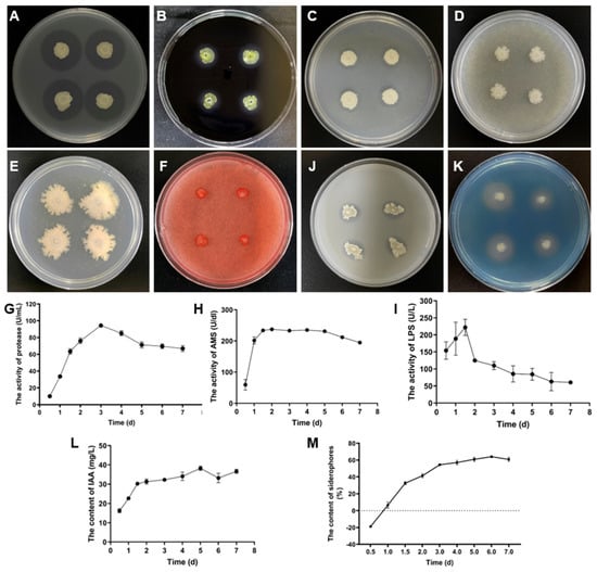 Determination the enzyme producing ability and plant-growth-promoting index of RC116. (A–F) Qualitative detection the ability of RC116 producing protease (A), α-amylase (B), lipase (C), chitinase ((D,E), (D): chitin as substrate, (E): colloidal chitin as substrate), and cellulose (F). (G–I) Changes of protease (G), α-amylase (H), and lipase (I) activities in the culture supernatant of RC116. (J) Qualitative detection the ability of RC116 dissolve inorganic phosphorus. (K) Siderophore qualitative detection of RC116 with the CAS method. (L,M) Changes in IAA concentration (L) and siderophores (M) with RC116. Error bars represent the standard deviation of three replications.