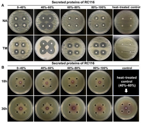 Lysis effect of RC116 extracellular proteins against plant pathogen: (A) lysis effect of RC116 extracellular proteins against Ralstonia solanacearum GMI 1000 (Rs); and (B) lysis effect of RC116 extracellular proteins against Fusarium oxysporum f. sp. Lycopersici (Fol). NA and TM were two agar plate; 0–40%, 40–60%, 60–80%, and 80–100% represent RC116 extracellular protein component precipitated by ammonium sulfate with different saturation; 40–60% saturation ammonium-sulfate-precipitated protein components were heat-treated at 100 °C for 10 min, then centrifugation at 12,000× g for 2 min as a heat-treated control.