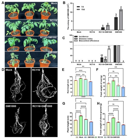 Biocontrol effects of RC116 on tomato bacteria wilt (TBW) and tomato-growth-promoting effect of RC116 in greenhouse. (A) Phenotype of tomato plantlets in different inoculation treatment groups. Mock indicates inoculation with NB medium as a control; RC116 indicates inoculation only with the cultures of RC116; RC116 + GMI 1000 indicates simultaneous inoculation with the cultures of RC116 and the bacterial solution of Rs; GMI 1000 indicates inoculation only with and the bacterial solution of Rs. (B) The statistics of GMI 1000 colony in different treatment groups. (C) The statistics of disease investigation results. (D) Morphology of tomato roots in different groups at 28 days after inoculation. (E–H) Plant-growth-promoting effect of RC116 on tomato aboveground and belowground. For pot experiments, each treatment contains 10 tomato plantlets, and 5 experiments were carried out. Data represented the means ± standard error. The different lowercase letters within the same column indicate a significant difference according to Duncan’s test (p < 0.05); asterisks indicate a significant difference at the level of p < 0.0001 (****), p < 0.001 (***), p < 0.01 (**), and p < 0.05 (*); and ns represents no significant difference.