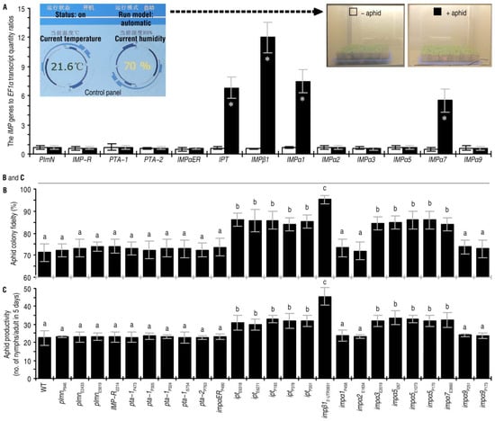 To determine if the IMP genes affect Arabidopsis defenses, colony fidelities and reproduction rates of aphids placed on leaves of the WT and imp plants were conveyed. If the aphid colony fidelity was higher on an imp mutant compared with the WT plant, the IMP was thought to be a positive regulator of Arabidopsis resistance to aphid colonization. The aphid colony fidelity rates on the ipt, impβ1, impα3, impα5, and impα7 mutants were significantly increased compared with the WT plants. Thus, IPT, IMPβ1, IMPα3, IMPα5, and IMPα7 contributed substantially to plant resistance (Figure 1B). Meanwhile, an IMP was thought inhibitive to aphid reproduction if the reproduction rate was greater on the imp mutant than on the WT plant. The imp mutants that favored the colonization of aphid (Figure 1B) also supported aphid reproduction (Figure 1C). The highest rate of aphid reproduction occurred on the impβ1 mutant (Figure 1C). These data suggested that IPT, IMPβ1, IMPα3, IMPα5, and IMPα7 contribute to Arabidopsis resistance against green peach aphid infestation and that IMPβ1 is the most influential resistance constituent.
