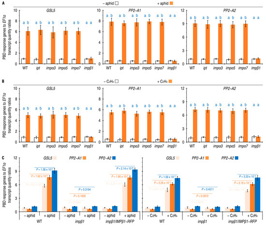 The five IMPs, including IMPβ1, affect PBD response gene expression in Arabidopsis plants responding to aphid infestation or ethylene (C2H4) treatment. (A) The gene expression in leaves of the WT and imp mutant plants that remained free from or artificially colonized with aphids. (B) The gene expression in leaves of the WT and imp mutant plants that were incubated in air or in 10 µL/L ethylene. (C) The gene expression in leaves of the WT, impβ1 mutant, and impβ1-complemented (impβ1/IMPβ1-RFP) transgenic plants that remained free from or artificially colonized with aphids. In (A,B), 20-day-old plants were treated differently as designed, and, 24 h later, RNA was isolated from the treated or equivalent leaves and analyzed by qRT-PCR, which used EF1α as a reference gene. Data shown are mean values ± SD estimates of results obtained from six independent experiments, each involving 200 aphids colonized on 10 plants. In (A,B) The different letters on the graphs indicate significant differences, as assessed using Duncan’s new multiple-range test (p < 0.01). In (C), p-values obtained in the two-sided student’s t-test are provided.