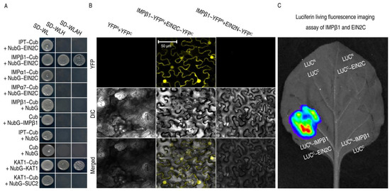 Our study found that IMPβ1 may be involved in the regulation of PBD by ethylene signaling. EIN2 is a critical factor in the positive regulation of the ethylene signaling pathway. To infer a functional relationship between EIN2 and IMPβ1, the IMPβ1 was subjected to protein–protein interaction assays with EIN2C (EIN2454–1294) using a split-ubiquitin-based yeast-two hybrid (SUB-Y2H) system. An interaction occurred specifically between EIN2C and IMPβ1, but not between EIN2C and any of the other IMPs (IPT, IMPα3, IMPα5, and IMPα7) (Figure 3A). The specificity was further evidenced by the positive control using KAT1 and the negative control using SUC2 (Figure 3A). To confirm and locate the IMPβ1 and EIN2C interaction, we carried out bimolecular fluorescence complementation (BiFC) assays. IMPβ1 was fused to the N-terminal half of YFP (YFPN), generating the IMPβ1:YFPN fusion protein, while EIN2N (EIN2N1−453) and EIN2C were fused to the YFP C-terminal half (YFPC), forming the EIN2N:YFPC and EIN2C:YFPC fusion protein (Figure 3B). An interaction was observed only between IMPβ1:YFPN and EIN2C:YFPC but not EIN2N:YFPC, and the interaction was found in the nucleus (Figure 3B and Figure S3). The IMPβ1-EIN2C interaction was corroborated by the luciferase assay performed on leaves of tobacco leaves (Figure 3C). Clearly, IMPβ1 interaction with EIN2C, creating a molecular basis for the possibility that IMPβ1 mediates EIN2C trafficking into the nucleus.