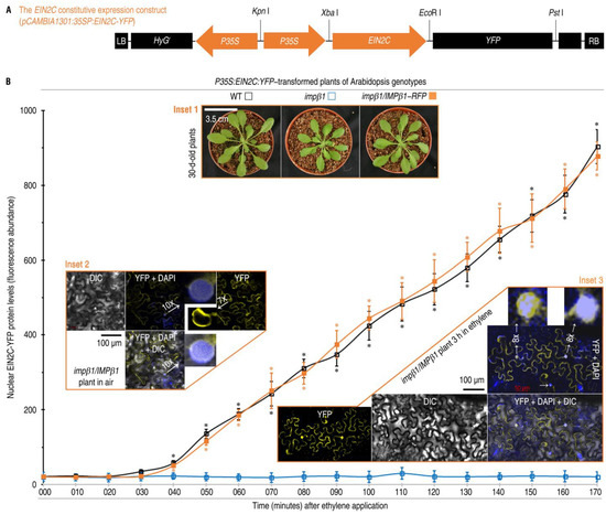 The EIN2C-YFP fusion protein moves into nuclei of Arabidopsis plants in the concomitant presence of IMPβ1 and ethylene. (A) Diagram of the fusion gene expression construct. (B) Chronological changes in relative concentrations of the fusion protein localized to plant nuclei. Leaves of the indicated plants (inset 1) were transformed with the construct shown in (A). These plants were shifted into 10 µL/L ethylene to grow for 40 h. Excised leaves were stained with DAPI and observed 10 min later by CLSM. Blue, orange, and black curves indicate the fluorescence abundance of EIN2C-YFP in the nucleus in WT, impβ1, and impβ1/IMPβ1-RFP plants, respectively. Each CLSM image (insets 2 and 3) represents six leaves from three plants. The quantitative data are shown as mean values ± SD estimates (n = six leaves). Asterisks indicate significant differences in WT, impβ1/IMPβ1-RFP compared with impβ1 plants (* p < 0.05; Student’s t-test).