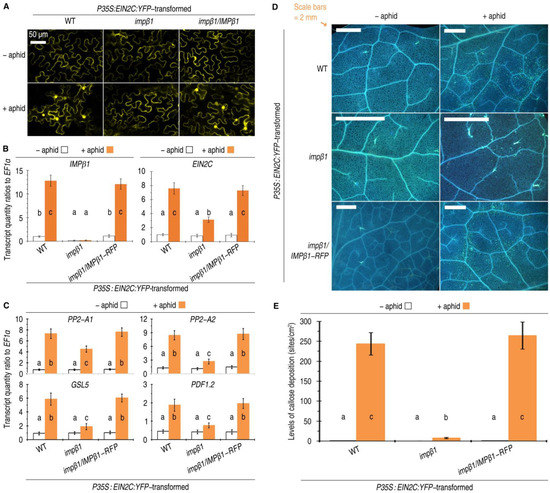 The aphid-induced nuclear import of EIN2C in the presence of a functional IMPβ1 provides the molecular basis for IMPβ1 to regulate EIN2-dependent insect-deterrent defense responses, which mainly include callose deposition and PBD response gene expression [10,21,22]. We found that these responses were induced in coincidence with constitutive expression of the EIN2C gene and aphid-induced expression of the IMPβ1 gene and the innate EIN2 gene in P35S:EIN2C:YFP-transformed WT and impβ1/IMPβ1-RFP plants. In both plants, the expression of IMPβ1 was significantly increased by artificial colonization with aphids in contrast to the ready-state expression levels detected in the aphid-free control (Figure 5B). Aphid-induced expression of the EIN2C was significantly inhibited in impβ1 plants compared with WT and impβ1/IMPβ1-RFP plants colonized with aphids (Figure 5B).