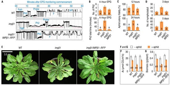 Assessment of aphid colony fidelity (Figure 6C) and reproductivity rates (Figure 6D) showed that the WT and impβ1/IMPβ1-RFP plants were more resistant than the impβ1 mutant to infestation by the aphid. Colony fidelity is the number of aphids remaining in the leaf colonies within 24 h, while reproductivity rate is the number of nymphs produced by an adult within five days after artificial colonization [21,22]. The aphid colony fidelity (Figure 6C) and reproductivity rates (Figure 6D) were significantly increased in the impβ1 mutant compared with the WT and impβ1/IMPβ1-RFP plants. Over 24 h, the aphid fidelity averaged 72% in the WT, 71% in impβ1/IMPβ1-RFP, and 92% in impβ1 plants, with about 22% higher in the mutant. In five days, totally 26, 23, and 58 nymphs, on average, were produced by an aphid adult individual in leaf colonies of the WT, impβ1/IMPβ1-RFP, and impβ1 plants, respectively. In other words, the presence of a functional IMPβ1 gene in the plants provided >55% resistance against aphid population growth. As a result of altered feeding, colonizing, and reproductive behaviors of the aphids, the impβ1 mutant incurred more severe infestations and displayed leaf chlorosis and necrosis (Figure 6E). The leaf infestations by aphids caused substantial reductions in net photosynthesis rates shown as AN variant (Figure 6F) and plant biomass (Figure 6G). These results demonstrate the critical role of IMPβ1 in the establishment of aphid-induced PBD, which develops in relevance to aphid-induced nuclear import of EIN2, impedes phloem-feeding activities, and reduces infestation of the plant.