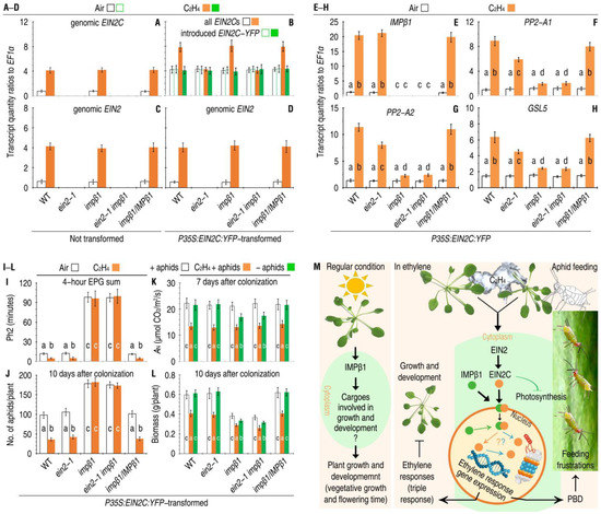Foliar expression levels of IMPβ1 and PBD response genes were quantified. In the absence of ethylene, the expression of IMPβ1 (Figure 7E) and PBD response genes, including PP2-A1, PP2-A2, and GSL5 (Figure 7F–H), remained around the steady-state levels all plants. In the presence of ethylene, P35S:EIN2C:YFP-transformed WT, impβ1/IMPβ1-RFP, and ein2-1 plants well supported the PBD-response gene expression (Figure 7F–H). However, ethylene displayed higher extents to induce the gene expression in the WT and impβ1/IMPβ1-RFP plants than in the ein2 mutant (Figure 7F–H). Furthermore, the gene expression was considerably inhibited in the impβ1 single mutant and impβ1 ein2-1 double mutant, even in the presence of ethylene (Figure 7F–H). These differences suggest that transient constitutive expression of EIN2C:YFP temporarily compensates the ein2-1 mutant defects in sufficient expression of the PBD-response genes only when ethylene and a functional IMPβ1 are concomitantly present in the plants. This compensation caused strong inhibitions to the phloem-feeding activities of aphid (Figure 7I), resulting in marked reductions in the aphid infestations (Figure 7J) in ein2-1 plants incubated with ethylene in contrast to the incubation in air. In this mutant, the introduced EIN2C provided inhibitions to aphid feeding and population growth as strong as in the WT and impβ1/IMPβ1-RFP plants (Figure 7I,J). On the contrary, the engineering EIN2C introduced into the impβ1 and impβ1 ein2-1 plants failed to execute any inhibitory effects on aphids, indicating that EIN2C functions downstream of IMPβ1 in ethylene signal transduction towards defense responses.