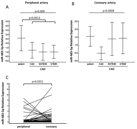 miRNA-483-5p association with CAD requiring intervention. Relative expression levels of miR-483-5p in (A) peripheral and (B) culprit coronary serum samples in chronic and acute (NSTEMI and STEMI) CAD patients. Kruskal–Wallis tests with Dunn and Hanover post hoc analyses were performed. (C) Relative expression of miR-483-5p in peripheral versus culprit coronary serum samples in NSTEMI and STEMI patients. Wilcoxon test for paired samples was performed. Patent = control; CAD = coronary artery disease; STEMI = ST-elevation myocardial infarction; NSTEMI = non-ST-elevation myocardial infarction.
