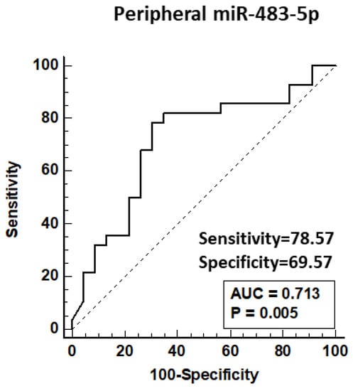 ROC analysis for peripheral miR-483-5p association with chronic CAD demonstrated an area under the curve of 0.713 (p = 0.005) with 79% sensitivity and 70% specificity of miR-483-5p p ≤ 0.77 for detection of CAD (Figure 2).