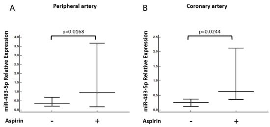 Further, we performed statistical analysis to identify whether there is a difference in miR-483-5p expression in serum samples of patients treated with either beta blockers, ACE inhibitors or aspirin versus patients who were not on these treatments. Interestingly, we noticed that patients receiving aspirin had significantly higher expression levels of miR-483-5p, both in peripheral and in culprit coronary serum samples (p = 0.0168 and p = 0.0244, respectively) (Figure 3).