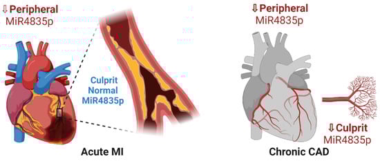 Alteration in gene expression patterns have been related to pathological cardiac conditions, which can lead to heart failure as we and others have previously described [1,2]. MicroRNAs (miRNAs) are key players in gene expression and protein regulation, and the scarcity or abundance of miRNAs in the cells may eventually lead to dysfunction of the tissues and ultimately to disease. Circulating miRNAs often reflect changes in miRNA expression in solid tissues and blood and their analysis can promote our understanding of different pathophysiological processes, including cardiovascular disease [3]. Different atherosclerotic manifestations, caused by genetic and environmental factors, contribute to chronic coronary artery disease (CAD) and eventually lead to acute myocardial infarction (MI), the leading cause of morbidity and mortality in developed countries [4,5,6].