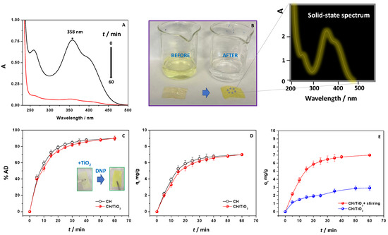 Solution stirring is an important parameter in adsorption phenomena because it affects the solute/adsorbate distribution in the solution bulk and the formation of the external boundary film [43]. In order to analyze the stirring effect in adsorption behavior, a 1.0 × 2.0 cm CH/TiO2 was thus placed in contaminated water (DNP amount = 18.50 mg/L, pH 4.5), at r.t, and monitored for 60 min both in the absence and presence of constant speed stirring. The adsorption capacity values plotted as a function of time are reported in Figure 1E.