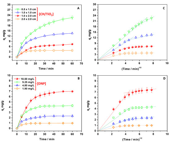 qt values of CH/TiO2 calculated by changing the amount of the adsorbent (A) and adsorbate (B); the Weber–Morris plot applied to data reported in panels A and B (C,D).