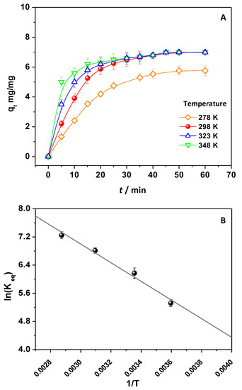The thermodynamic parameters of the process were inferred by changing the temperature of the solutions containing DNP. In detail, using a 1.0 × 2.0 cm CH/TiO2 and a DNP solution 18.50 mg/L solution at pH 4.5, the temperature was changed from 278 to 348 K. So, the qt values were evaluated and reported in Figure 3A.
