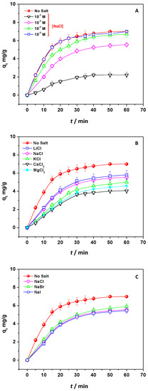 Finally, the type of electrolytic anion was changed by fixing Na+ as a cation, and the effect of Cl−, Br−, and I− was studied (Figure 4C). The qt values, in this case, occurred similarly to each other, even if the anion nature changed. Since the effect of anion should probably be interpreted in terms of diffusion and competition onto the absorbent positively charged surface, no effect was observed in the explored contact time. On the other hand, the role of cations was directly exerted in the solution by screening the charge of the pollutant, and this effect occurred more pronounced during the process.