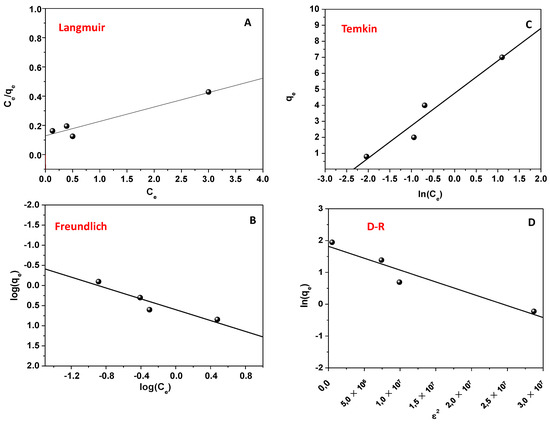 Isotherms of adsorption: Langmuir (A); Temkin (B); Freundlich (C); and D-R (D).