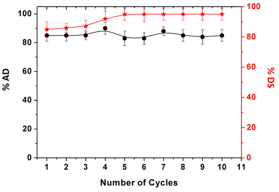 As discussed in the introduction, the main aim of this paper is the possibility of recycling the adsorbent. The first explored approach was focused on desorption experiments to recover even the pollutant. Due to the presence of Coulombian interactions between DNP and chitosan, a diluted NaCl solution (0.05 M) was selected to favor the adsorbent regeneration. Specifically, the adsorbent was swelled inside the salt-based solution after DNP adsorption and continuously stirred. For this purpose, different NaCl concentrations were tried, and the one that favored the quite complete desorption of DNP in a relatively short time was selected. So, the solution in contact with the chitosan film was spectrophotometrically monitored, and 20 min was selected as the best contact time for the complete desorption. Then, according to Equation (16), the % of desorbed DNP was calculated by evaluating the adsorbent reuse for 10 cycles of adsorption/desorption. The results, in terms of % of adsorption and desorption, are reported in Figure 6, denoting that the prolonged use of CH/TiO2 did not affect its efficiency, which remained high. Indeed, by looking at the error bars associated with each desorption measurement, it is possible to assess that significant statistical differences were not observed. Moreover, the slight increment of % DS after the fourth cycle could be associated with the retained pollutant in the previous cycles that was not completely desorbed.