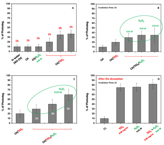 It is well known that, under the adopted work conditions, •OH radicals (highly reactive and not-selective) are the main produced species that favors DNP degradation [6]. To assess the latter purpose, as the first step, the role of simple UV radiation was evaluated by fixing 1 h as irradiation time. In this case, the film without TiO2 was adopted to adsorb DNP and then placed in pure water under continuous irradiation. As reported in Figure 7A, the % of photodegradation in 1 h was very low, obtaining only 10% of the DNP degradation. The result was also confirmed when the degradation was attempted directly in water containing DNP without CH, indicating that the DNP was relatively stable under UV light. The same result was also observed when H2O2 was added to the solution surrounding the CH film. Specifically, the concentration was fixed at 0.02 M, and no changes in terms of DNP degradation were observed with respect to only UV light. Conversely, the process enhancement was noted using the CH/TiO2 film. Indeed, the presence of TiO2 increased the DNP photodegradation, and the effect was more pronounced by extending the contact time from 1 to 5 h. In particular, the % of DNP degradation changed from 20% to 40%, ranging from 1 to 5 h, respectively. With the aim to improve the efficiency of the process but reduce the irradiation time at 1 h, the addition of H2O2 was considered, and its concentration was changed from 0.01 to 0.03 M, restituting a dose-dependent result (Figure 7B). Under these conditions, the DNP photodegradation increased up to 40%, even if irradiation time was settled at 1 h. The lack of important differences between the use of H2O2 at 0.02 and 0.03 M concentrations could be attributed to the hydroxyl radicals self-quenching in the solution surrounding the adsorbent [6]. Moreover, the TiO2 activation blocked onto CH could be reduced in favor of H2O2 photolysis, which acts as a UV “filter” when its concentration is high [6]. Overall, the combined use of H2O2 and TiO2 appeared useful, and a relatively low amount of H2O2 can be employed for the purpose. By extending the irradiation time to 5 h, the DNP photodegradation increases, reaching about 60% under this condition of work (Figure 7C). However, it is worth mentioning that using a greater H2O2 amount for an extended irradiation time favored the film’s degradation, which appeared solubilized in water. So, these harsh experimental conditions should be avoided if aiming to reuse the adsorbent again. While they should be useful to destroy both the adsorbent and adsorbate.