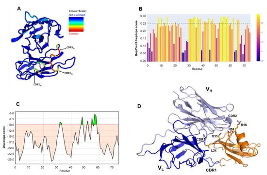 To predict the paratope region of MB59, we used the Antibody i-Patch algorithm implemented in the SabPred interface [25]. Starting models for the paratope prediction were the structure of the homology model of CD59-blocking minibody obtained here and the deposited structure of CD59 (PDB code 2ofs). In SabPred, each residue is scored according to its probability to be involved in antigen binding, upon comparison with previously described antibody–antigen structures [25]. The prediction of the residues of the epitope of CD59 was performed using BepiPred-3.0 [26], a sequence-based tool and the software Discotope [27], which provides structure-based predictions of discontinuous epitopes.