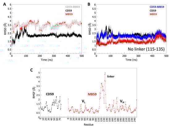 AlphaFold2.0 generated a highly reliable structure model, with Local Distance Difference Test score, pLDDT >85. A 500 ns MD simulation was carried out from this starting model using the Amber99sb all-atom force field with tip3p water model in the isobaric-isothermal (NPT) ensemble at 300 K, using periodic boundary condition (Section 4). The evaluation of root-mean-square deviations (RMSD) (calculated on the protein Cα atoms) between the starting models and the trajectory structures shows limited conformational variations for CD59, with RMSD values lower than 2.5 Å (Figure 3A,B). Higher values are computed for MB59 and for the CD59-MB59 complex (close to 3.5 Å). However, this is to be ascribed to the high conformational flexibility of the linker between the VL and VH chains of MB59 (residues 115–135). When this linker is removed from the calculation, RMSD values computed on Cα atoms of MB59 and CD59-MB59 complex drop close to 1.5 Å and 2.5 Å, respectively (Figure 3B). A low conformational variability of the CD59-MB59 complex is confirmed by root-mean-square fluctuations (RMSF) values, computed in an equilibrated region of trajectory (last 400 ns of the MD simulation). Indeed, high RMSF values characterise the linker region whereas those of the rest of the structure range between 0.5 and 2.5 Å (Figure 3C).
