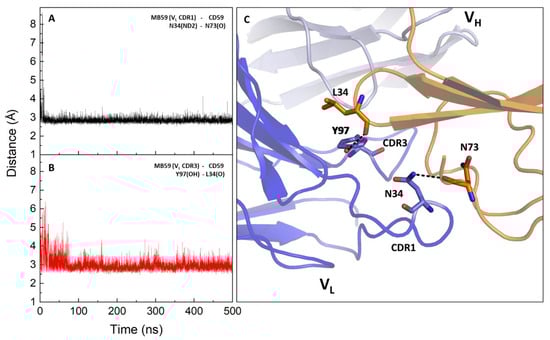 Hydrogen bonding distance evolution of representative key interactions in the MD trajectory of the MB59-CD59 complex. (A,B) Time evolution of H-bonding interactions involving MB59 CDR1 (A) and CDR3 (B). (C) Cartoon representation showing the H-bonding interactions on a representative structure of the trajectory (the closest to the average structure).