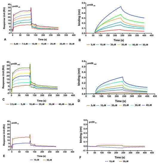 Overlay of sensorgrams obtained for the binding of the three bi-cyclic peptides to CD59 using SPR (A,C,E) and BLI (B,D,F) techniques. The curves of pm59sh are reported in (A,B), the curves of pm59md are reported in (C,D) and the curves of pm59ln are reported in (E,F).