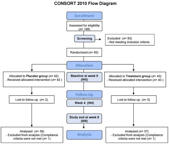 A study designed as a randomized, double-blind, placebo-controlled parallel-group study is shown as a flow diagram. A total of 85 participants were randomized into two groups at baseline (W0): 42 participants were in the placebo group and 43 participants were in the treatment group. The intervention took 8 weeks (W8) and the same parameters were measured at W0 and W8. Abbreviations: W, week.