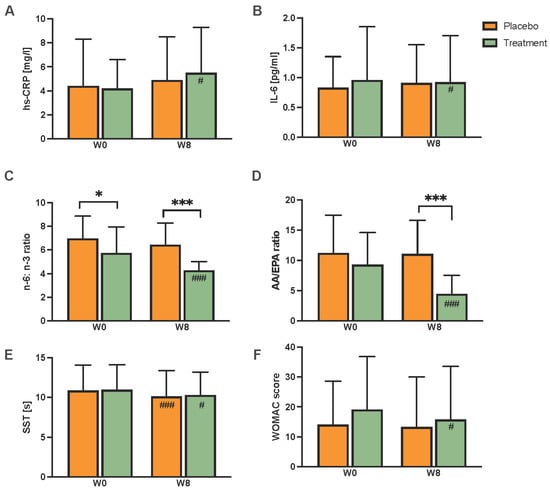 Effect of supplementation on hs-CRP levels (A) and IL-6 levels (B) comparing the placebo and treatment groups at study start (W0) and study end (W8). Further, FA plasma ratios were calculated as the n-6/n-3 ratio (C) and the AA/EPA ratio (D), as well as differences within and between groups at physical function tests Sit- and Stand test (E), and WOMAC score (F) before (W0) and after (W8) the eight-week intervention. Values are expressed as mean ± SD from 39 (placebo) and 37 (treatment) participants. Abbreviations: W, week; hs-CRP, high-sensitivity C-reactive protein, IL, interleukin; n, omega; AA, arachidonic acid; SST, Sit-to-Stand test; WOMAC, Western Ontario and McMaster Osteoarthritis Index. Statistics: # indicates differences between W0 and W8 within the treatment and placebo groups (calculated by either a paired t-test or Wilcoxon test). * Indicates differences between placebo and treatment group at W0 or W8. #, * p < 0.05; and ###, *** p < 0.001 (D-L, calculated by either unpaired t-test or Mann–Whitney U test).