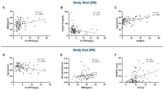 Correlations were conducted at study start (W0) (A–C) and showed a positive association between the BMI and hs-CRP (A), a negative association of hs-CRP with vitamin D (B), and a positive correlation between the WOMAC score and age (C). Correlations at study end (W8) (D–F) showed a negative correlation between hs-CRP and age (D), a positive association between the BMI and the sucralose/erythritol ratio (E), and a positive correlation between the SST and WOMAC score (F). Abbreviations: BMI, body mass index; hs-CRP, high-sensitivity C-reactive protein; WOMAC, Western Ontario and McMaster Osteoarthritis Index. SST, Sit-to-Stand test; S/E ratio, sucralose/erythritol ratio. Statistics: Correlations are shown as scatterplots with Spearman’s rho as the correlation coefficient.