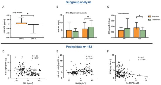 Subgroup analysis (A–D) and correlation analysis of pooled data from the parallel group with the elderly (D–F) were conducted. The subgroup analysis with only women showed a positive reduction of the ΔI-FABP within the treatment group and a difference between the treatment and placebo groups (placebo n = 30, treatment n = 30) (A). Only women with obesity showed a difference at the W8 time point of the S/E ratios (5–24 h) between the placebo and treatment groups (placebo n = 21, treatment n = 27) (B). Regarding the age categories of the 20–50 year old subjects, the hs-CRP level at W8 was higher in the treatment group compared to the placebo (placebo n = 20, treatment n = 16) (C). By pooling the present cohort and aged participants from a partner study (n = 152) at the W8 time point, Spearman’s-rank correlation (R) showed a negative association between n-3 PUFA levels and the BMI (D), a positive correlation of the n-6/n-3 ratio in plasma to the BMI (E), and a negative correlation between EPA plasma levels and hs-CRP (F). Abbreviations: BMI, body mass index; EPA, eicosapentaenoic acid; hs-CRP, high-sensitivity C-reactive protein; n-3 PUFA, omega-3 polyunsaturated fatty acids; n-6/n-3 ratio, omega-6-to-omega-3 ratio. Statistics: Grouped bar plots (A–C) and correlations are shown as scatterplots with Spearman’s rho as correlation coefficient (D–F). # indicates differences between W0 and W8 within the group. * Indicates differences between the placebo and treatment groups at W0 or W8. #, * p < 0.05; ** p < 0.01.